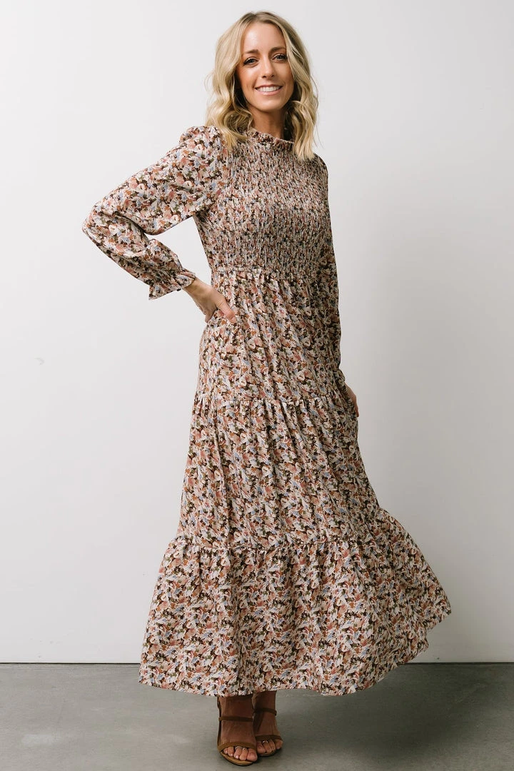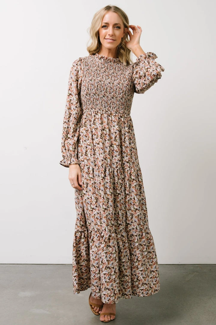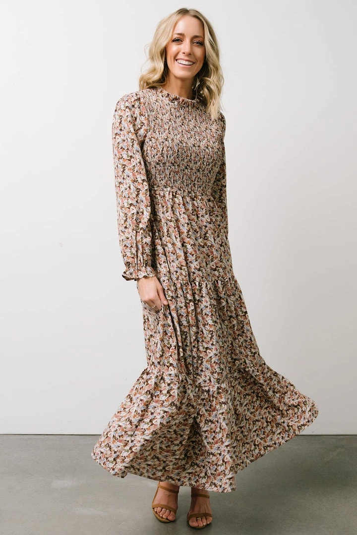 HAY Luella Smocked Maxi Dress | Beige + Mauve Floral