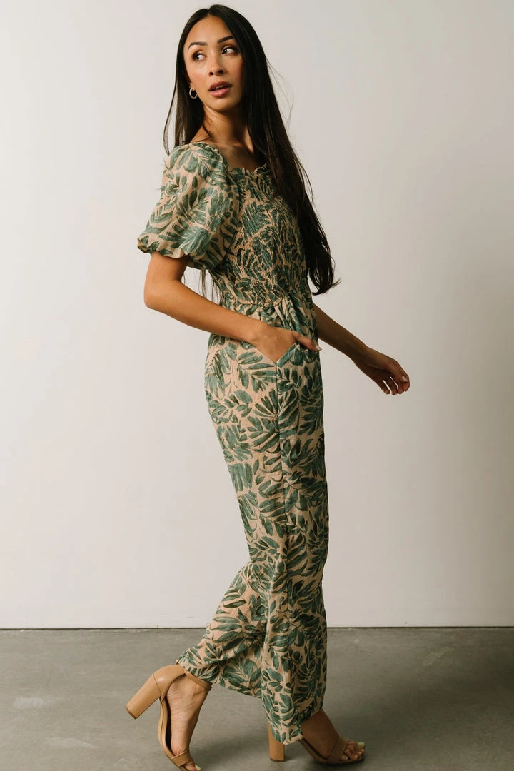 HAY Vacation Jane Smocked Jumpsuit | Sage Palm Print