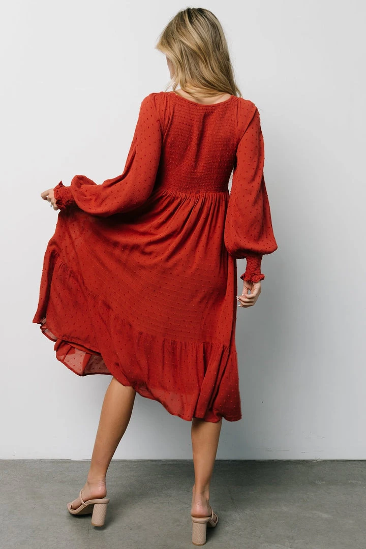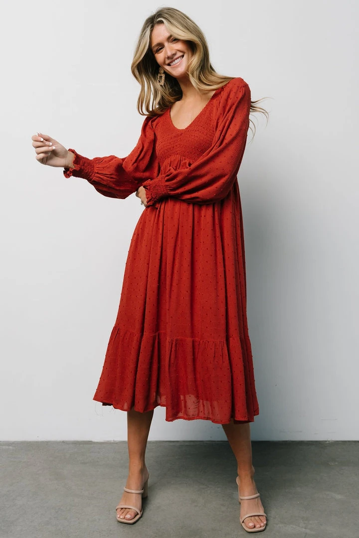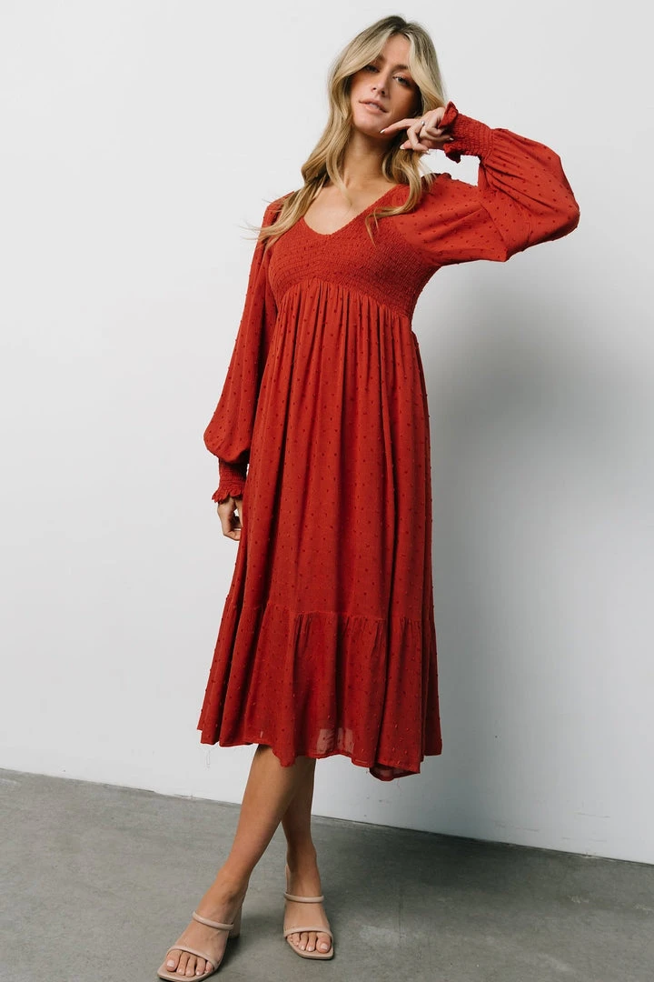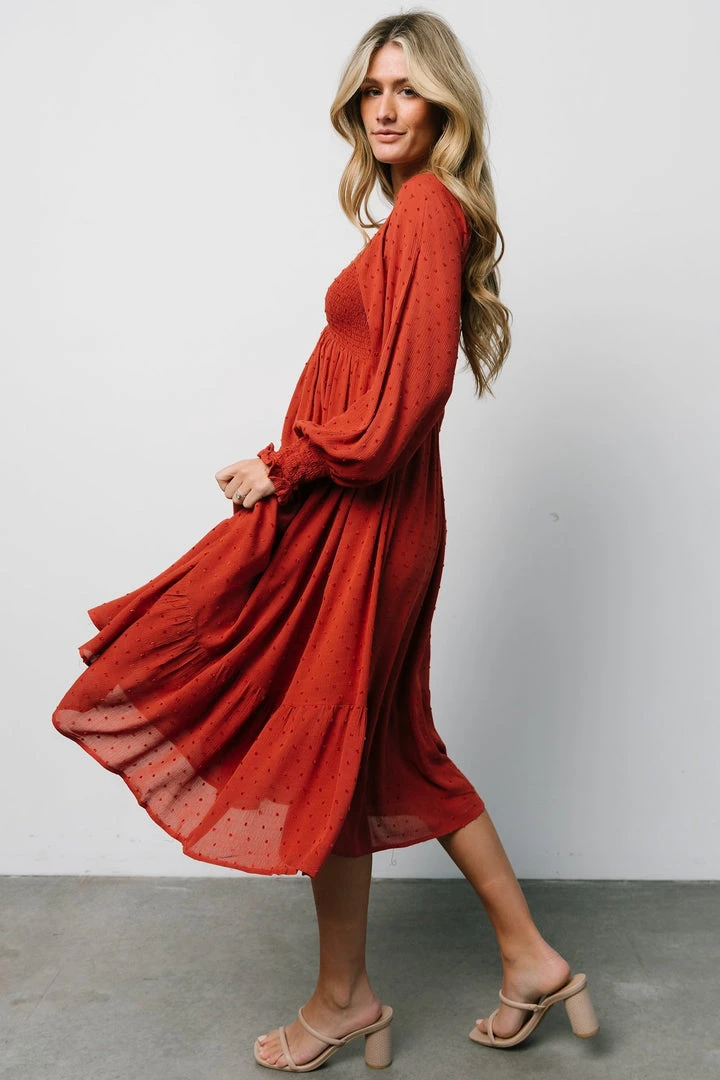 IL Lainey Smocked Dotted Midi Dress | Rust