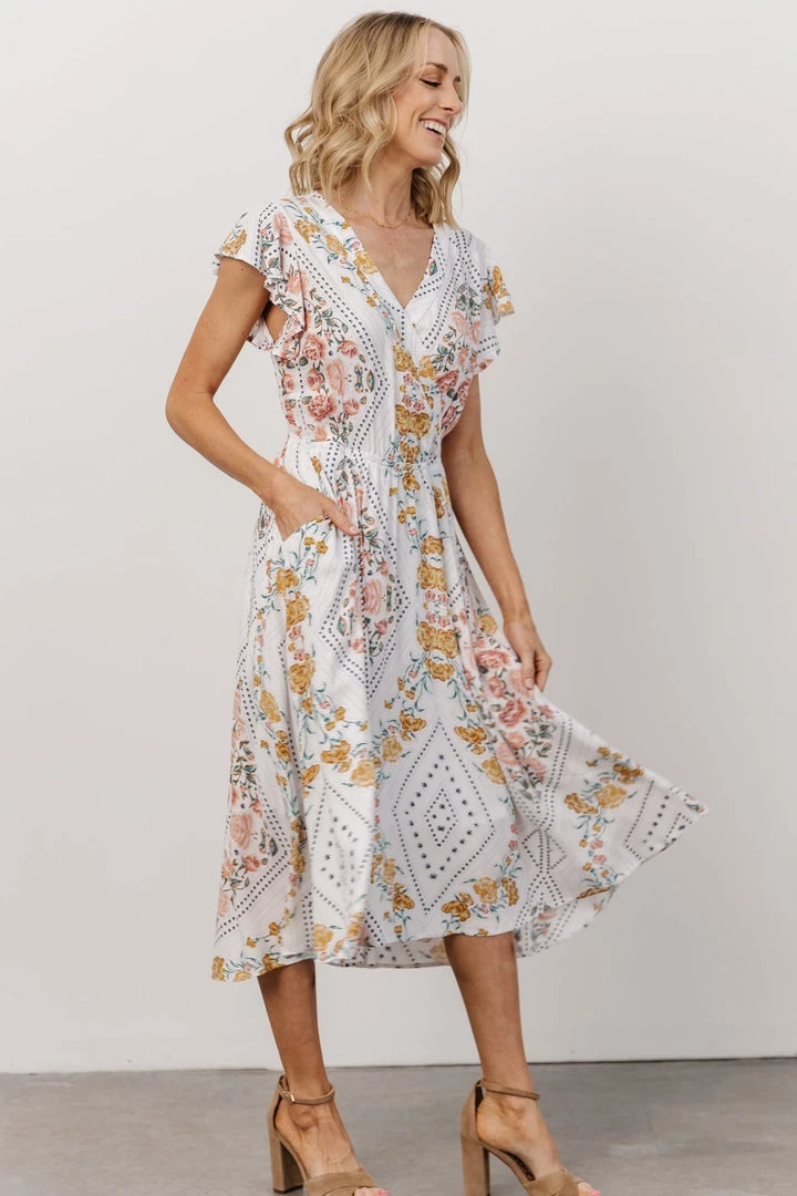 KA Wren Ruffle Sleeve Midi Dress | Ivory Geometric Floral Print Dresses