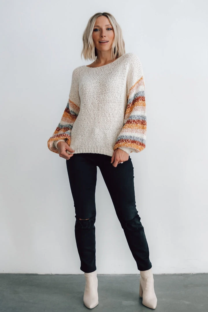 - Chunky knit oatmeal material with multi color stripes down sleeves