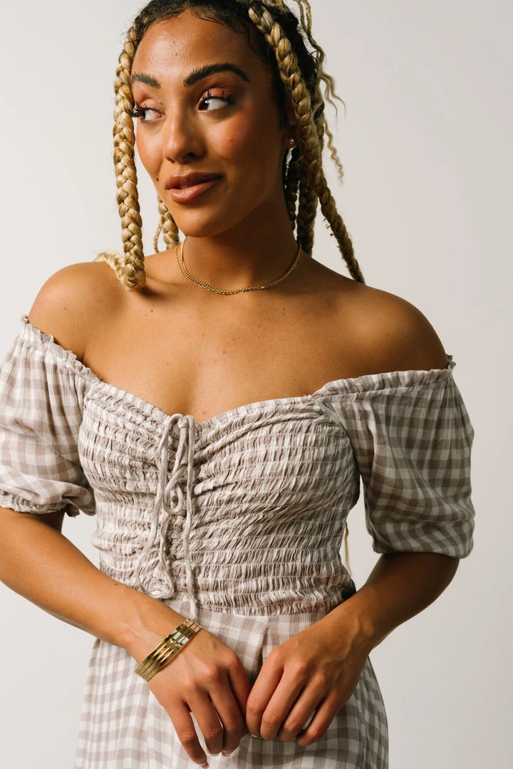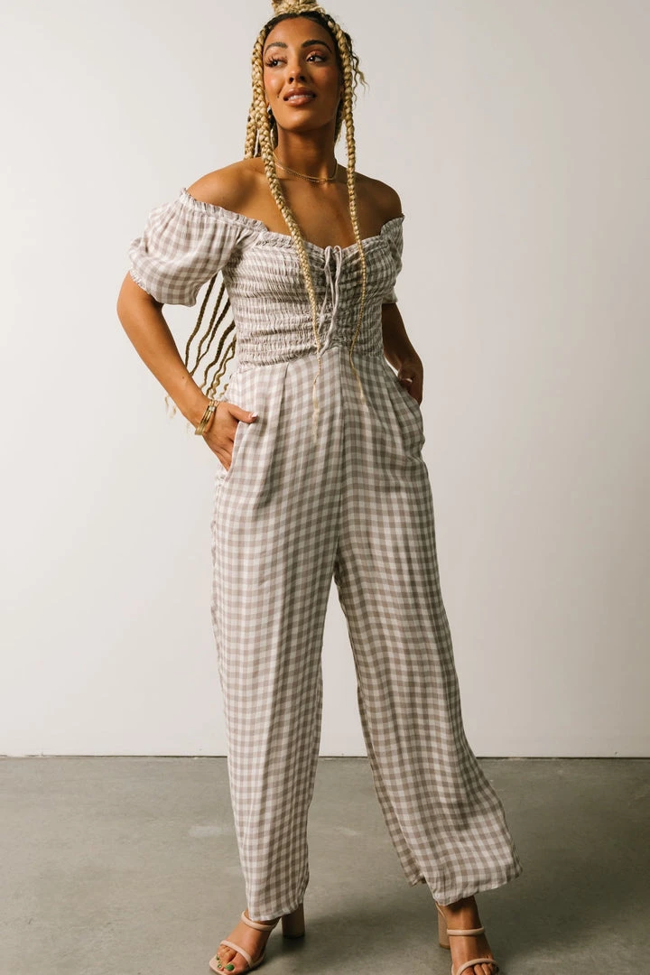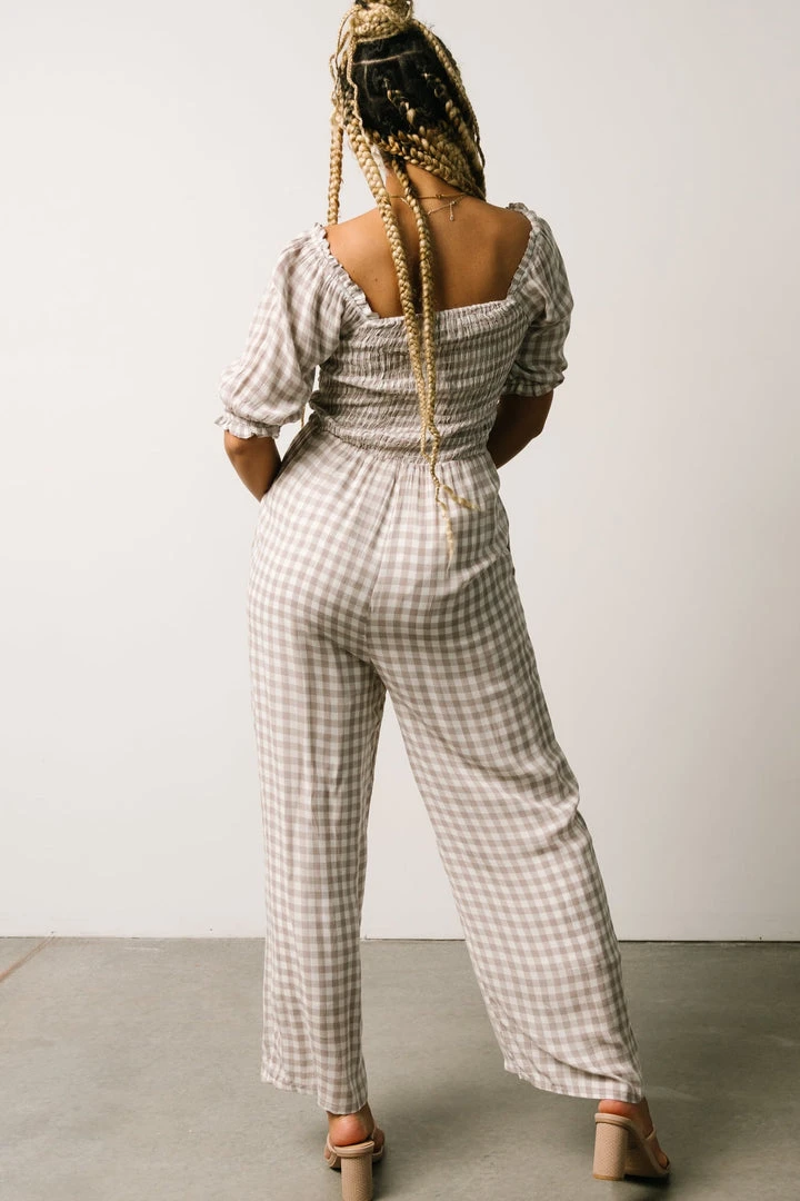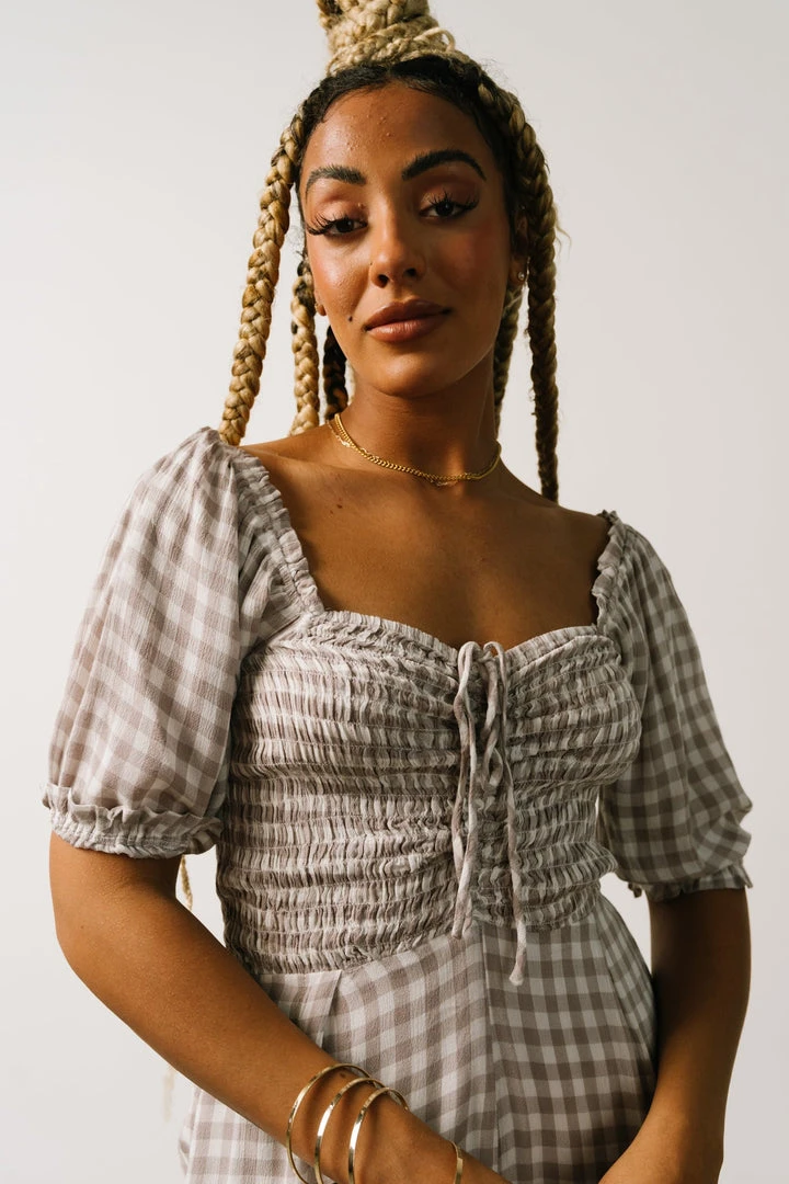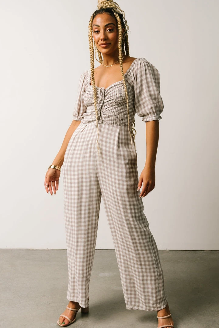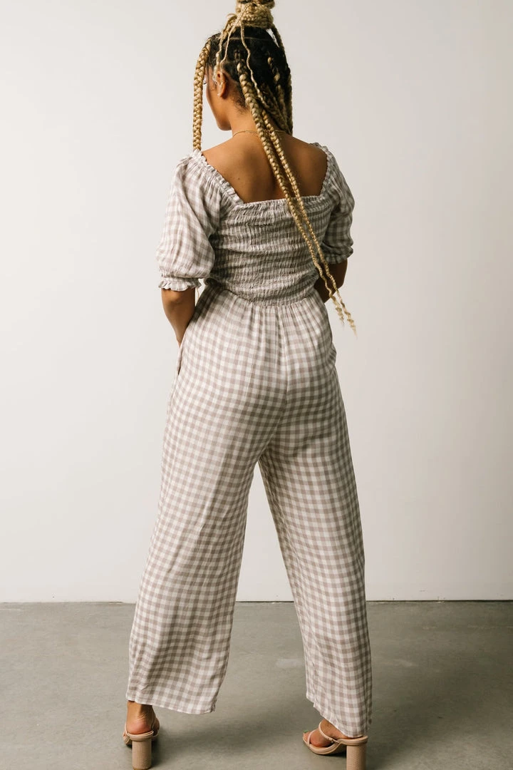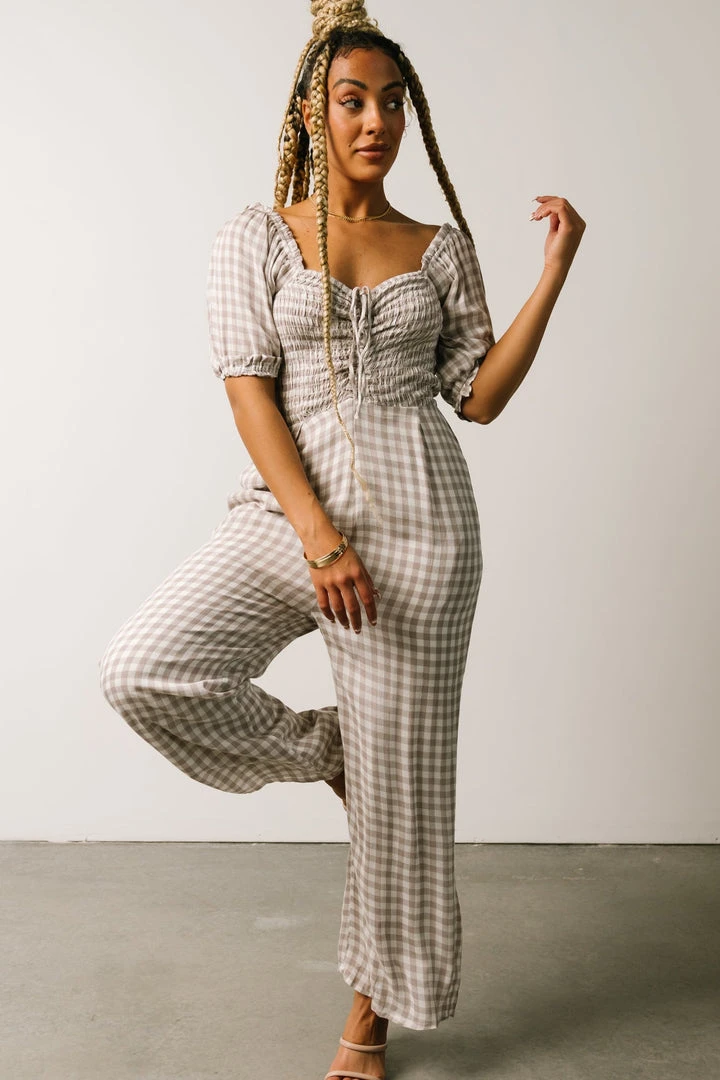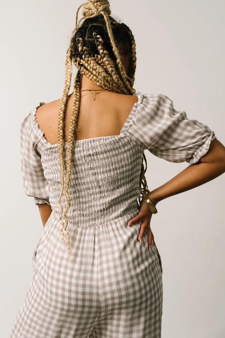POL Addie Smocked Jumpsuit | Taupe Gingham Boho