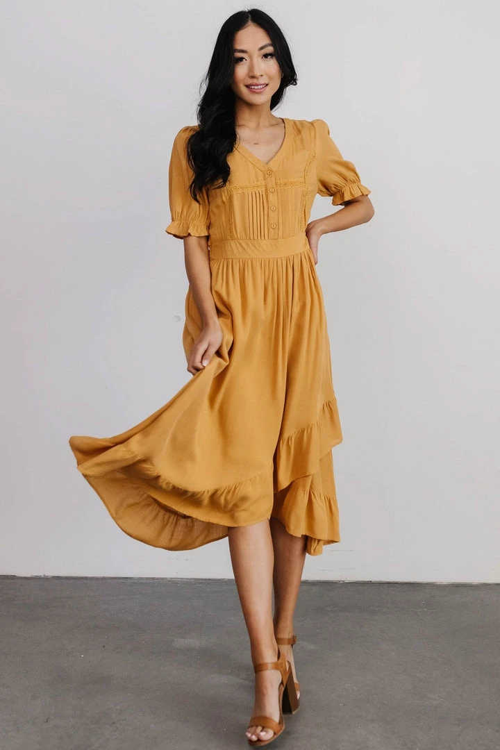 - Split ruffle detail at bottom of skirt
