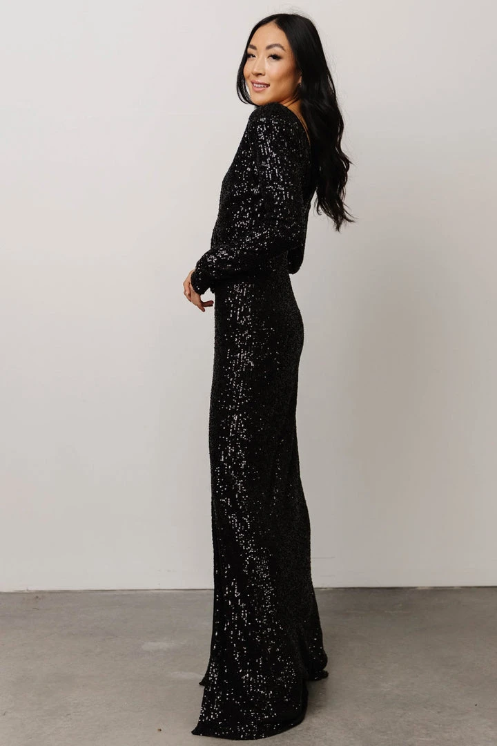 Sold in four stunning colors, the Zurich Long Sleeve Sequin Gown is here to make a statement. With a draped bodice detail and flowy sequin material, you will feel like a Goddess wearing this sexy yet sophisticated piece. And don’t get us started on the shoulder pads! We love a bold, confident fit.
