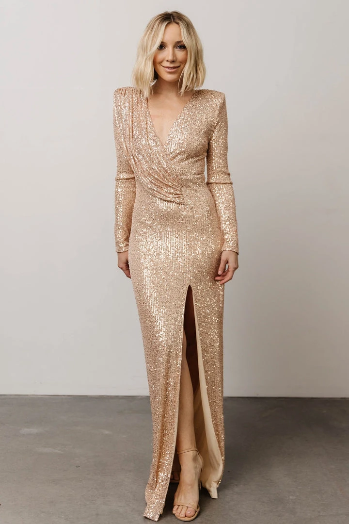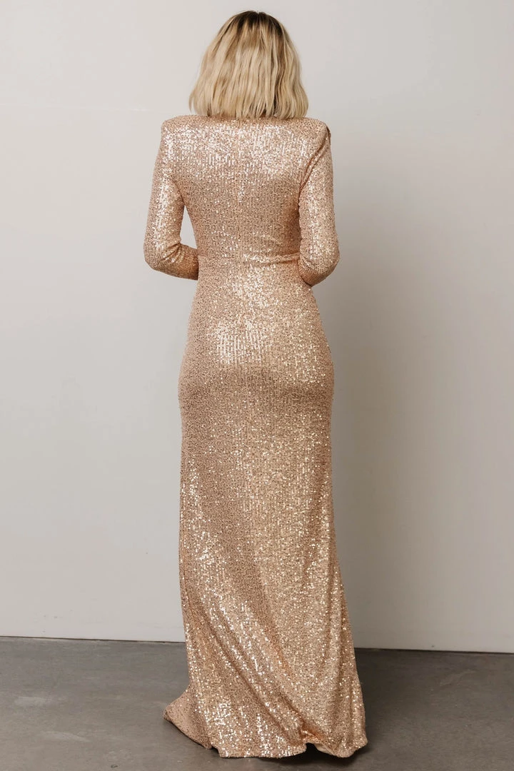 Sold in four stunning colors, the Zurich Long Sleeve Sequin Gown is here to make a statement. With a draped bodice detail and flowy sequin material, you will feel like a Goddess wearing this sexy yet sophisticated piece. And don’t get us started on the shoulder pads! We love a bold, confident fit.