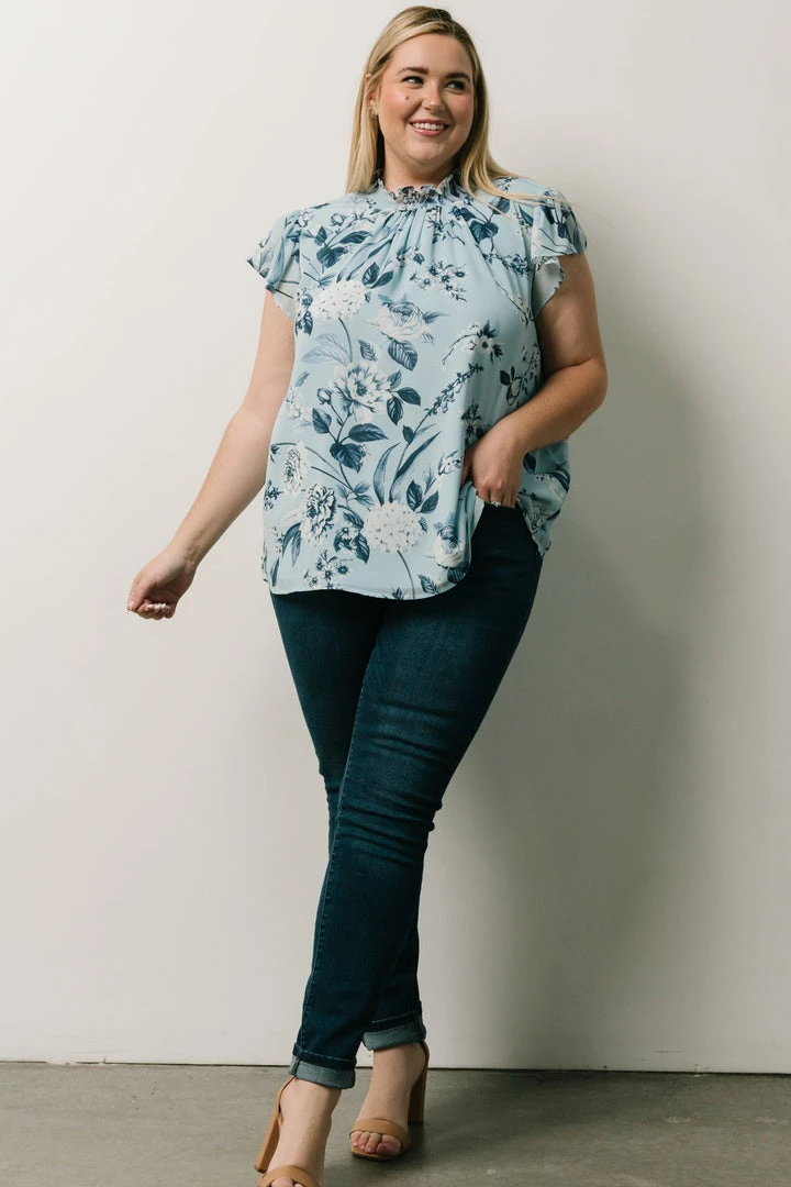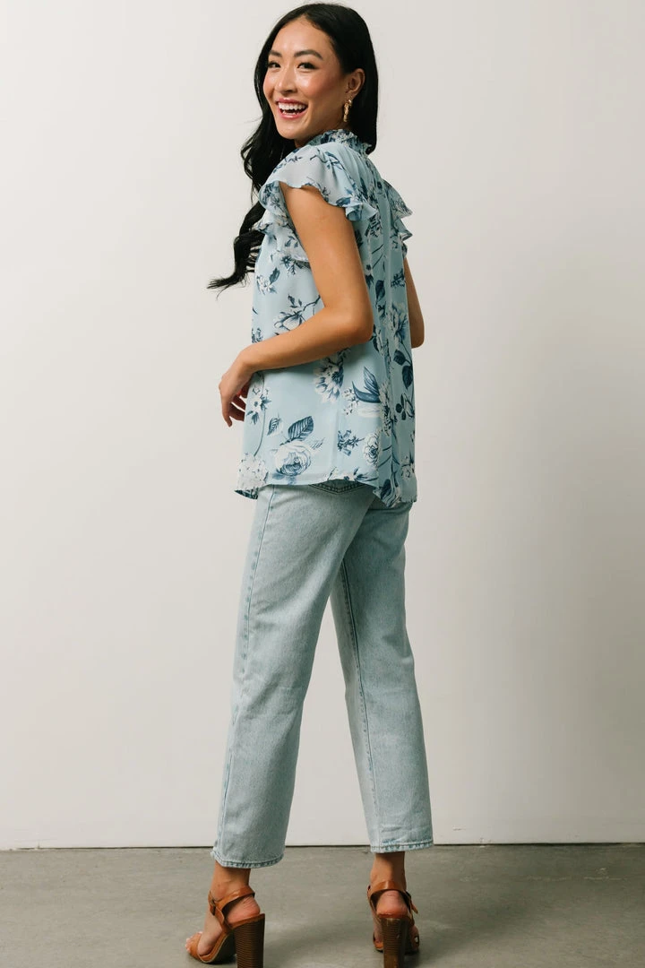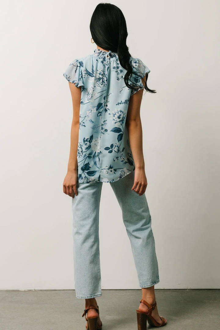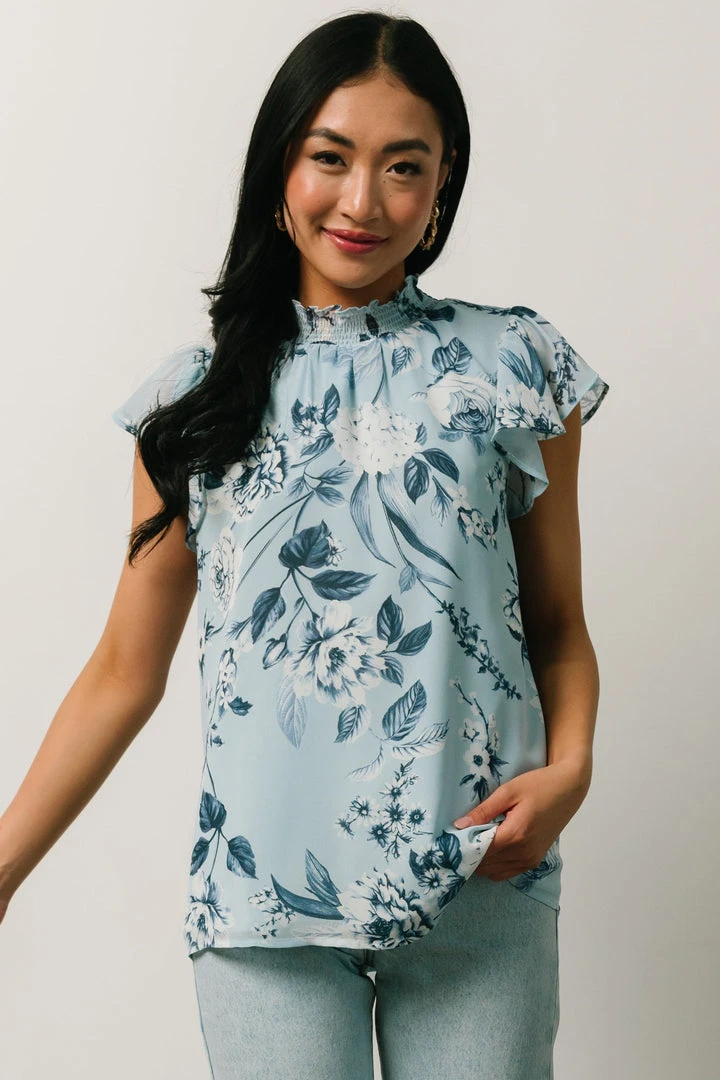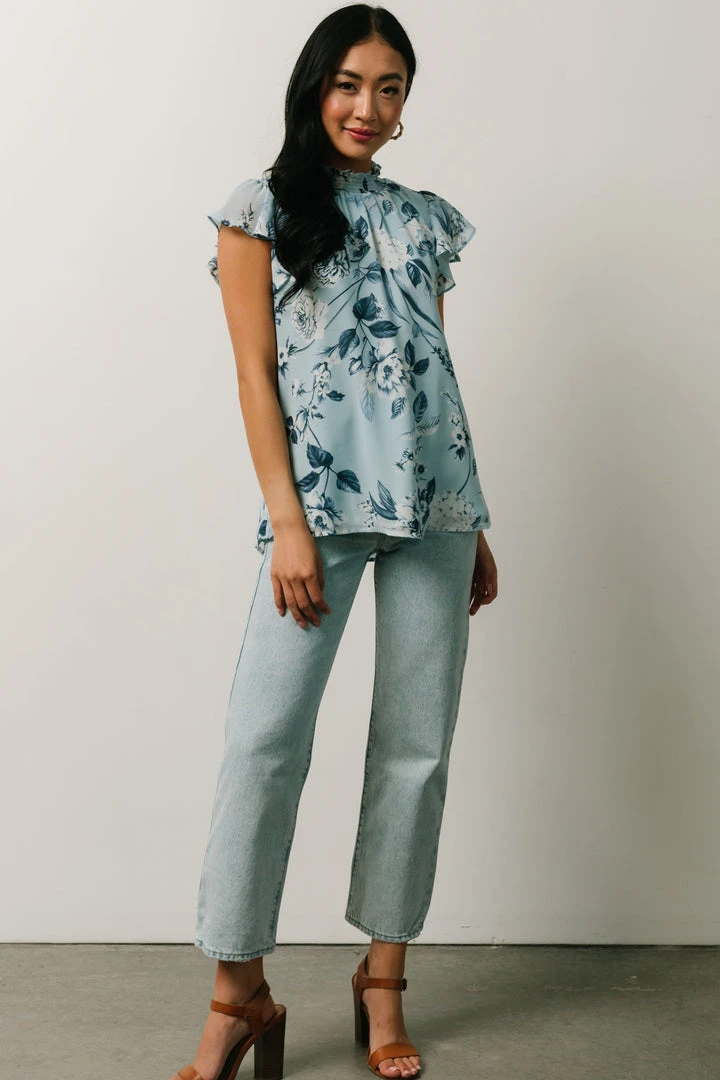 SL Chloe Mock Neck Top | Light Blue Floral Tops